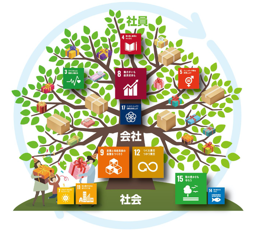 社会と会社と社員は互いに密接に関連しており、その大木から生み出されたパッケージがお客様の幸せ(ハピネス)を生み出し、そのお客様がさらにより良い社会を創造していく、この図にはそんな願いが込められています。